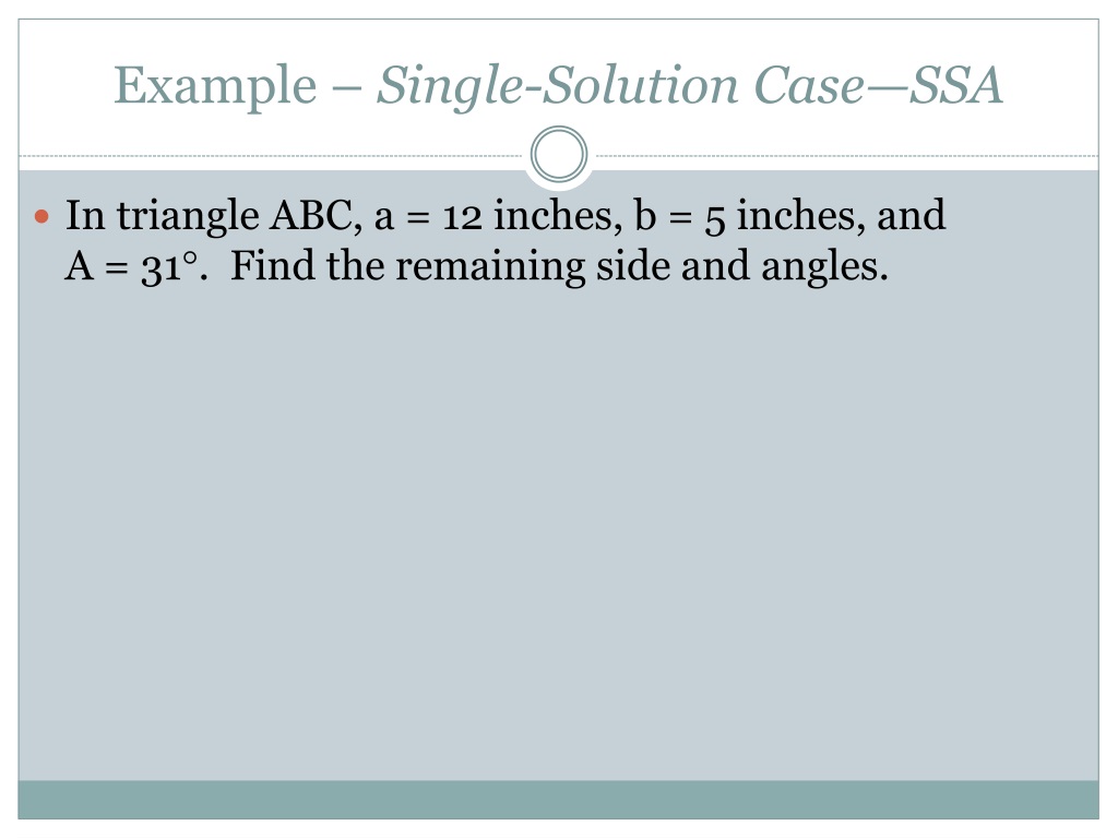 Example – Single-Solution Case—SSA In triangle ABC, a = 12 inches, b = 5 inches, and A = 31. Find the remaining side and angles.