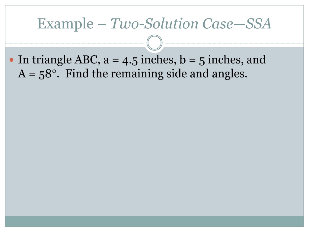 Example – Two-Solution Case—SSA In triangle ABC, a = 4.5 inches, b = 5 inches, and A = 58. Find the remaining side and angles.