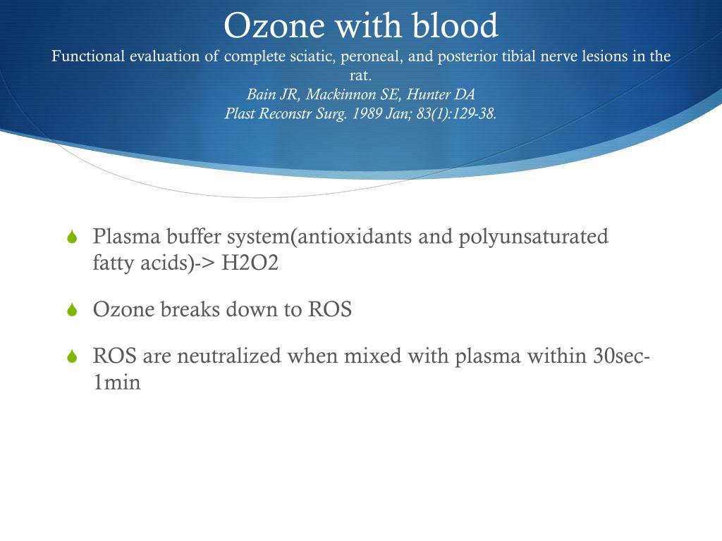 Ozone with blood Functional evaluation of complete sciatic, peroneal, and posterior tibial nerve lesions in the rat.Bain JR, Mackinnon SE, Hunter DAPlast Reconstr Surg. 1989 Jan; 83(1):129-38. • Plasma buffer system(antioxidants and polyunsaturated fatty acids)-> H2O2 • Ozone breaks down to ROS • ROS are neutralized when mixed with plasma within 30sec- 1min