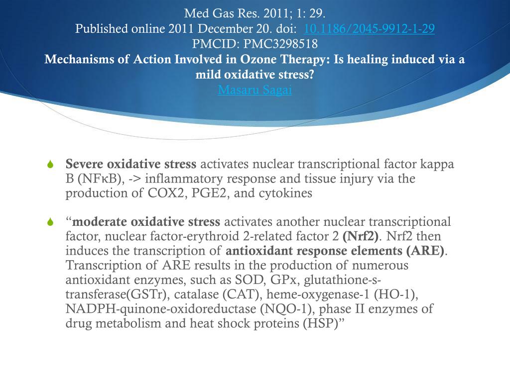 Med Gas Res. 2011; 1: 29.Published online 2011 December 20. doi: 10.1186/2045-9912-1-29PMCID: PMC3298518Mechanisms of Action Involved in Ozone Therapy: Is healing induced via a mild oxidative stress?Masaru Sagai • Severe oxidative stress activates nuclear transcriptional factor kappa B (NFκB), -> inflammatory response and tissue injury via the production of COX2, PGE2, and cytokines • “moderate oxidative stress activates another nuclear transcriptional factor, nuclear factor-erythroid 2-related factor 2 (Nrf2). Nrf2 then induces the transcription of antioxidant response elements (ARE). Transcription of ARE results in the production of numerous antioxidant enzymes, such as SOD, GPx, glutathione-s-transferase(GSTr), catalase (CAT), heme-oxygenase-1 (HO-1), NADPH-quinone-oxidoreductase (NQO-1), phase II enzymes of drug metabolism and heat shock proteins (HSP)”