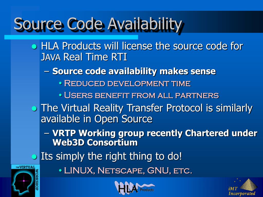 Source Code Availability • HLA Products will license the source code for JAVA Real Time RTI • Source code availability makes sense • Reduced development time • Users benefit from all partners • The Virtual Reality Transfer Protocol is similarly available in Open Source • VRTP Working group recently Chartered under Web3D Consortium • Its simply the right thing to do! • LINUX, Netscape, GNU, etc.