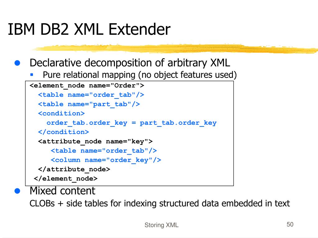 IBM DB2 XML Extender • Declarative decomposition of arbitrary XML • Pure relational mapping (no object features used) <element_node name="Order"> <table name="order_tab"/> <table name="part_tab"/> <condition> order_tab.order_key = part_tab.order_key </condition> <attribute_node name="key"> <table name="order_tab"/> <column name="order_key"/> </attribute_node> </element_node> • Mixed content CLOBs + side tables for indexing structured data embedded in text Storing XML