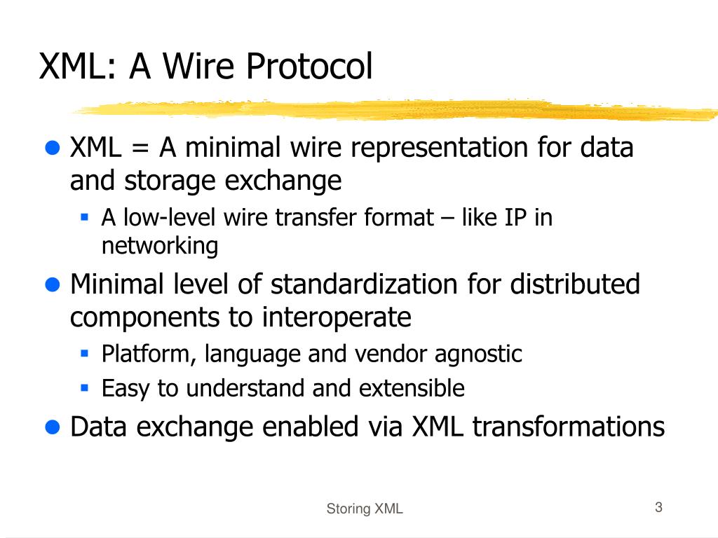 XML: A Wire Protocol • XML = A minimal wire representation for data and storage exchange • A low-level wire transfer format – like IP in networking • Minimal level of standardization for distributed components to interoperate • Platform, language and vendor agnostic • Easy to understand and extensible • Data exchange enabled via XML transformations Storing XML