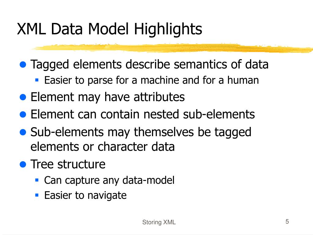 XML Data Model Highlights • Tagged elements describe semantics of data • Easier to parse for a machine and for a human • Element may have attributes • Element can contain nested sub-elements • Sub-elements may themselves be tagged elements or character data • Tree structure • Can capture any data-model • Easier to navigate Storing XML