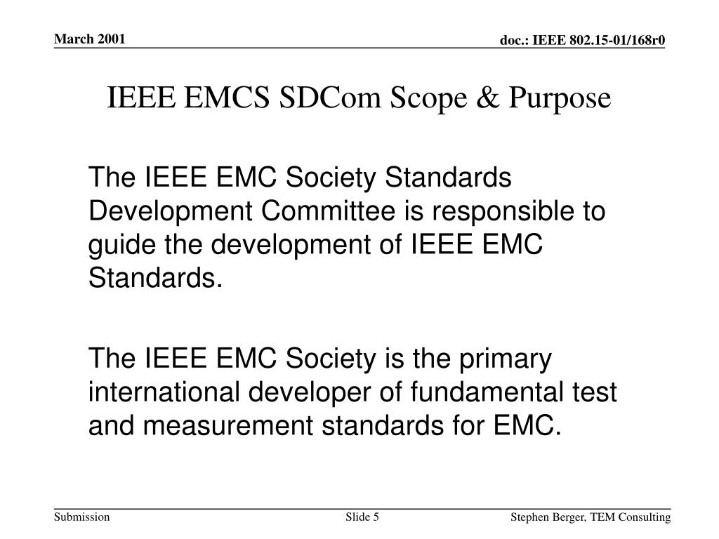 IEEE EMCS SDCom Scope & Purpose The IEEE EMC Society Standards Development Committee is responsible to guide the development of IEEE EMC Standards. The IEEE EMC Society is the primary international developer of fundamental test and measurement standards for EMC. Stephen Berger, TEM Consulting