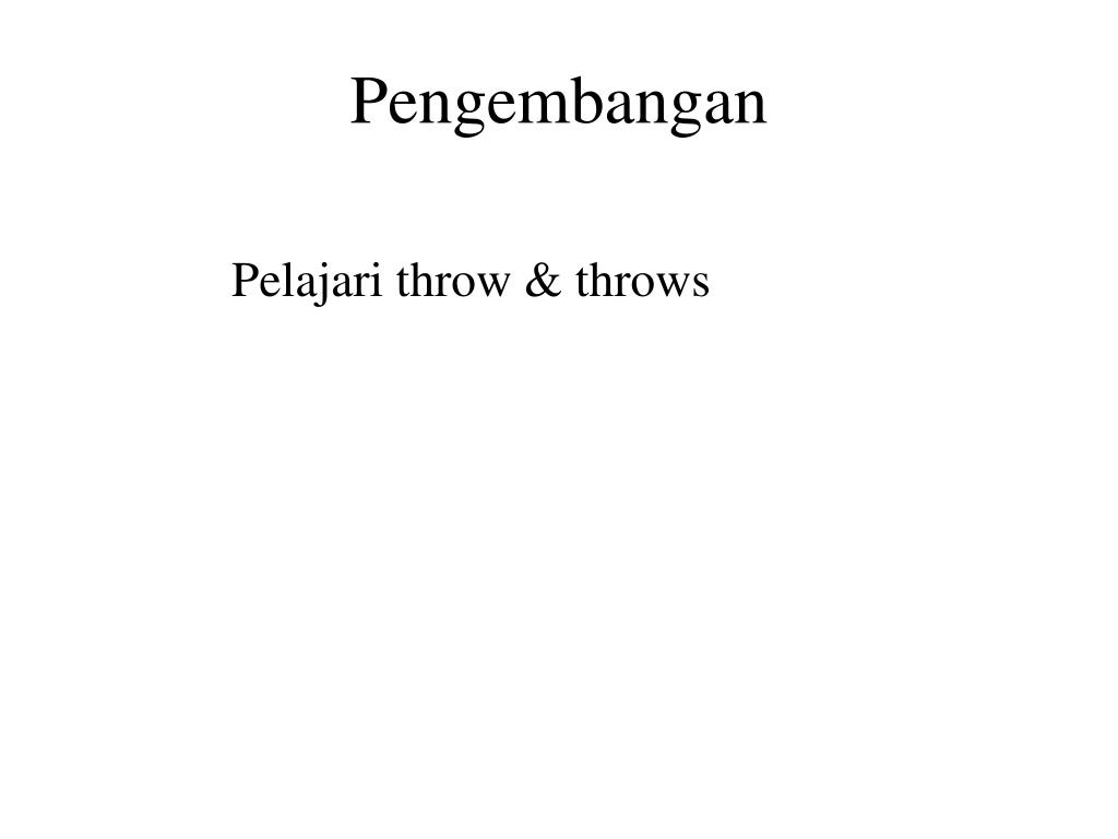 Contoh Tanpa exception: 1. public class BagiNol { 2. public static void main(String[] args) { 3. System.out.println("Sebelum pembagian"); 4. System.out.println(5/0); 5. System.out.println("Sesudah pembagian"); 6. } 7. } Keterangan: Baris ke-5 tidak akan dieksekusi karena ada kesalahan pembagian dengan bilangan nol pada baris ke-4