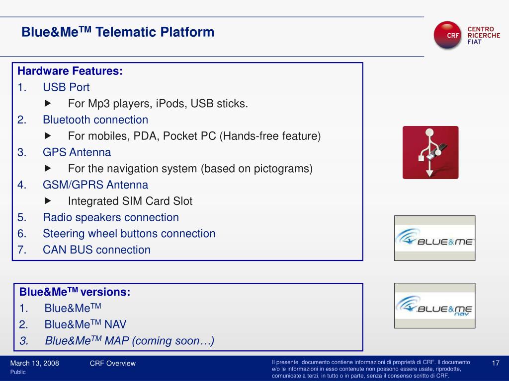 Blue&MeTM Telematic Platform • Hardware Features: • USB Port • For Mp3 players, iPods, USB sticks. • Bluetooth connection • For mobiles, PDA, Pocket PC (Hands-free feature) • GPS Antenna • For the navigation system (based on pictograms) • GSM/GPRS Antenna • Integrated SIM Card Slot • Radio speakers connection • Steering wheel buttons connection • CAN BUS connection Blue&MeTM versions: Blue&MeTM Blue&MeTM NAV Blue&MeTM MAP (coming soon…) CRF Overview