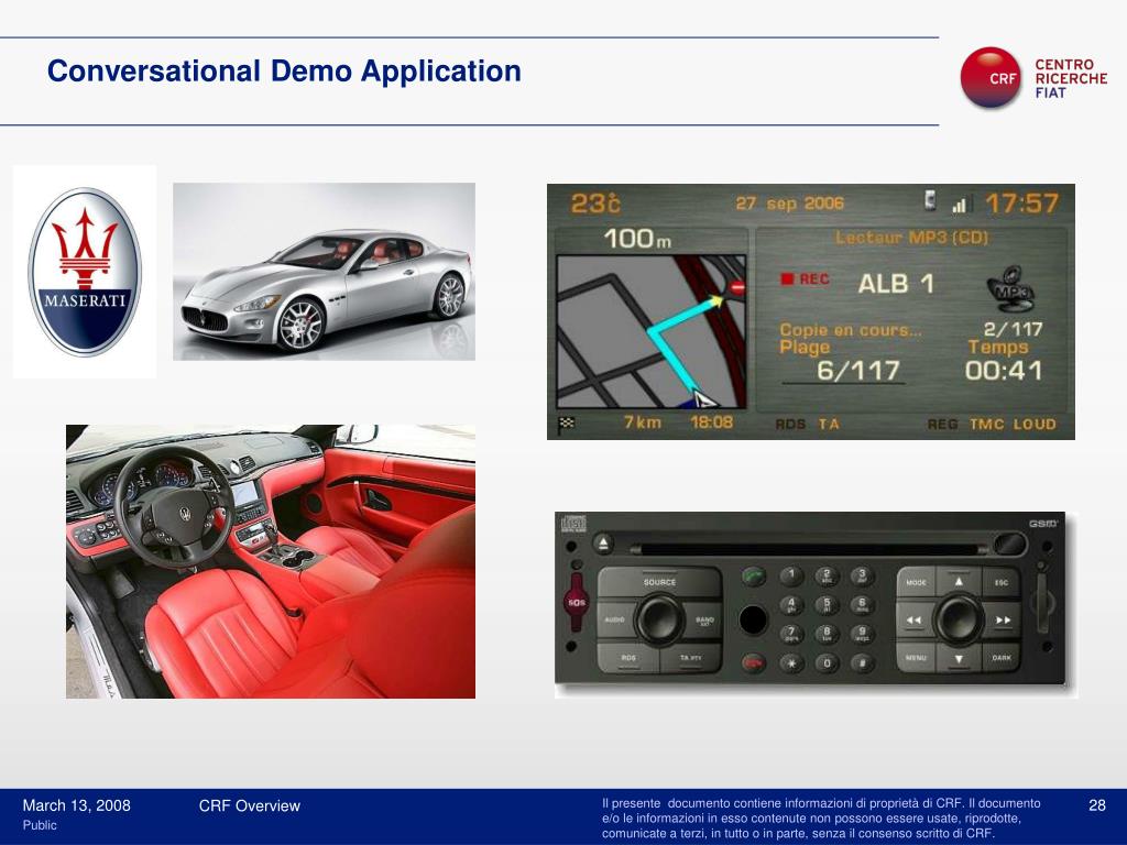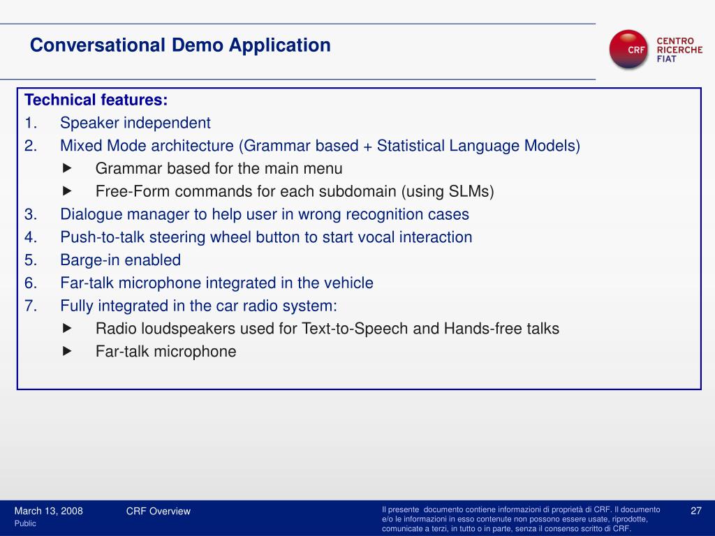 Conversational Demo Application • Technical features: • Speaker independent • Mixed Mode architecture (Grammar based + Statistical Language Models) • Grammar based for the main menu • Free-Form commands for each subdomain (using SLMs) • Dialogue manager to help user in wrong recognition cases • Push-to-talk steering wheel button to start vocal interaction • Barge-in enabled • Far-talk microphone integrated in the vehicle • Fully integrated in the car radio system: • Radio loudspeakers used for Text-to-Speech and Hands-free talks • Far-talk microphone CRF Overview
