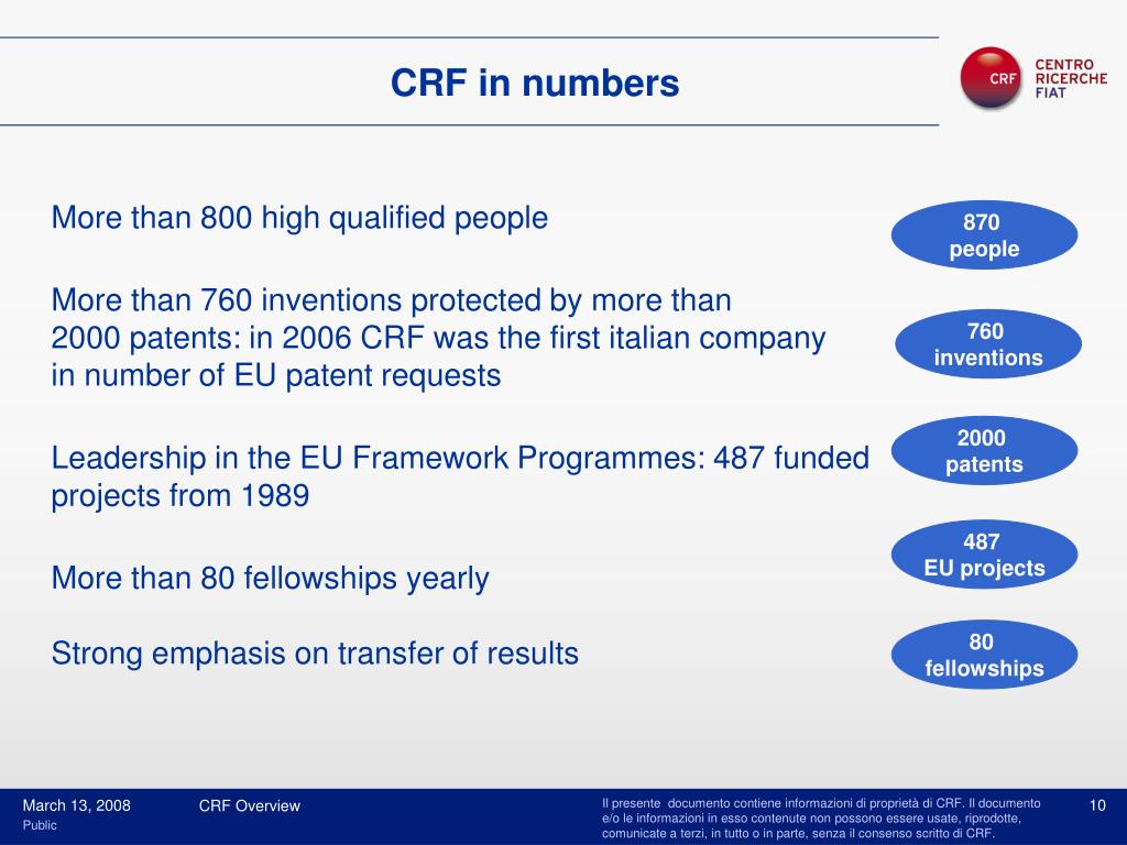 CRF in numbers More than 800 high qualified people More than 760 inventions protected by more than 2000 patents: in 2006 CRF was the first italian companyin number of EU patent requests Leadership in the EU Framework Programmes: 487 funded projects from 1989 More than 80fellowships yearlyStrong emphasis on transfer of results 870 people 760 inventions 2000 patents 487 EU projects 80 fellowships CRF Overview