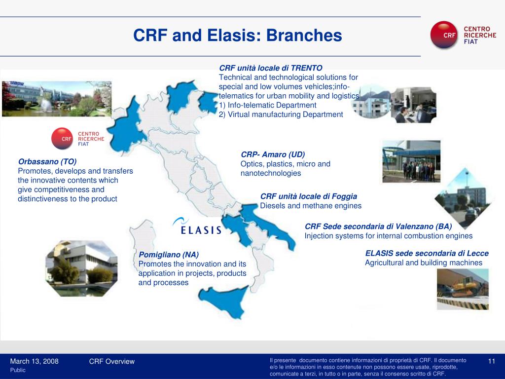 CRF and Elasis: Branches CRF unità locale di TRENTO Technical and technological solutions for special and low volumes vehicles;info-telematics for urban mobility and logistics 1) Info-telematic Department 2) Virtual manufacturing Department CRP- Amaro (UD) Optics, plastics, micro and nanotechnologies Orbassano (TO) Promotes, develops and transfers the innovative contents which give competitiveness and distinctiveness to the product CRF unità locale di Foggia Diesels and methane engines CRF Sede secondaria di Valenzano (BA) Injection systems for internal combustion engines ELASIS sede secondaria di Lecce Agricultural and building machines Pomigliano (NA) Promotes the innovation and its application in projects, products and processes CRF Overview