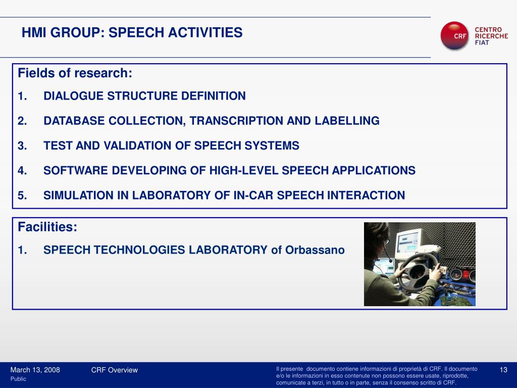 HMI GROUP: SPEECH ACTIVITIES Fields of research: DIALOGUE STRUCTURE DEFINITION DATABASE COLLECTION, TRANSCRIPTION AND LABELLING TEST AND VALIDATION OF SPEECH SYSTEMS SOFTWARE DEVELOPING OF HIGH-LEVEL SPEECH APPLICATIONS SIMULATION IN LABORATORY OF IN-CAR SPEECH INTERACTION Facilities: SPEECH TECHNOLOGIES LABORATORY of Orbassano CRF Overview