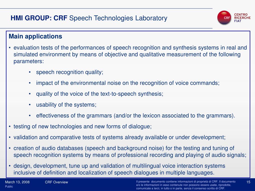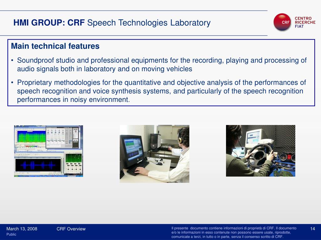 HMI GROUP: CRF Speech Technologies Laboratory Main technical features • Soundproof studio and professional equipments for the recording, playing and processing of audio signals both in laboratory and on moving vehicles • Proprietary methodologies for the quantitative and objective analysis of the performances of speech recognition and voice synthesis systems, and particularly of the speech recognition performances in noisy environment. CRF Overview