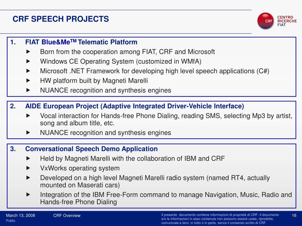 CRF SPEECH PROJECTS • FIAT Blue&MeTM Telematic Platform • Born from the cooperation among FIAT, CRF and Microsoft • Windows CE Operating System (customized in WMfA) • Microsoft .NET Framework for developing high level speech applications (C#) • HW platform built by Magneti Marelli • NUANCE recognition and synthesis engines • AIDE European Project (Adaptive Integrated Driver-Vehicle Interface) • Vocal interaction for Hands-free Phone Dialing, reading SMS, selecting Mp3 by artist, song and album title, etc. • NUANCE recognition and synthesis engines • Conversational Speech Demo Application • Held by Magneti Marelli with the collaboration of IBM and CRF • VxWorks operating system • Developed on a high level Magneti Marelli radio system (named RT4, actually mounted on Maserati cars) • Integration of the IBM Free-Form command to manage Navigation, Music, Radio and Hands-free Phone Dialing CRF Overview