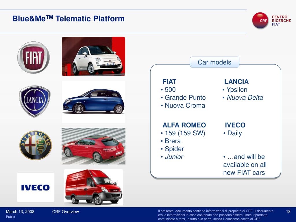 Blue&MeTM Telematic Platform Car models FIAT • 500 • Grande Punto • Nuova Croma LANCIA • Ypsilon • Nuova Delta ALFA ROMEO • 159 (159 SW) • Brera • Spider • Junior IVECO • Daily • …and will be available on all new FIAT cars CRF Overview