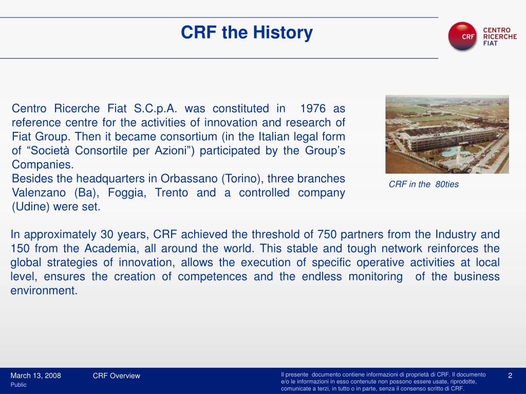 CRF the History Centro Ricerche Fiat S.C.p.A. was constituted in 1976 as reference centre for the activities of innovation and research of Fiat Group. Then it becameconsortium (in the Italian legal form of “Società Consortile per Azioni”) participated by the Group’s Companies. Besides the headquarters in Orbassano (Torino), three branches Valenzano (Ba), Foggia, Trento and a controlled company (Udine) were set. CRF in the 80ties In approximately 30 years, CRF achieved the threshold of 750 partners from the Industry and 150 from the Academia, all around the world. This stable and tough network reinforces the global strategies of innovation, allows the execution of specific operative activities at local level, ensures the creation of competences and the endless monitoring of the business environment. CRF Overview