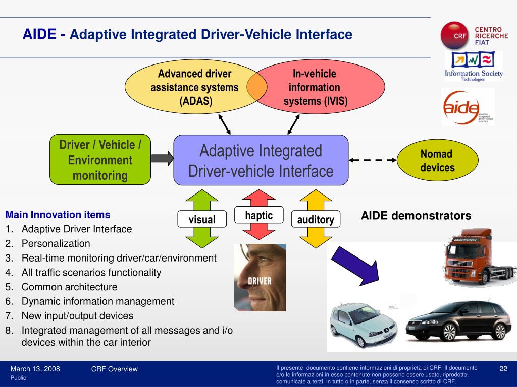 AIDE - Adaptive Integrated Driver-Vehicle Interface Duration: 4 years Started: March 04 29 partners (~50/50 industry-academia division), coordinated by Volvo Technology. Part of the EUCAR Integrated Safety Program AIDE core group: VTEC (coordinator), BMW, Bosch, CRF, ICCS, JRC, PSA and TNO Objective: To develop HMIconcepts required for safe and efficient integration of ADAS and IVIS systems into the driving environment The AIDE system monitors the Driver, the Vehicleand the Environment (DVE) state and adapts the driver-vehicle interface accordingly. Examples: • Lock-out/postpone non-critical information on demanding situations • Adapt the timing/intensity of safety warnings (e.g. warn earlier when the driver is inattentive) CRF Overview