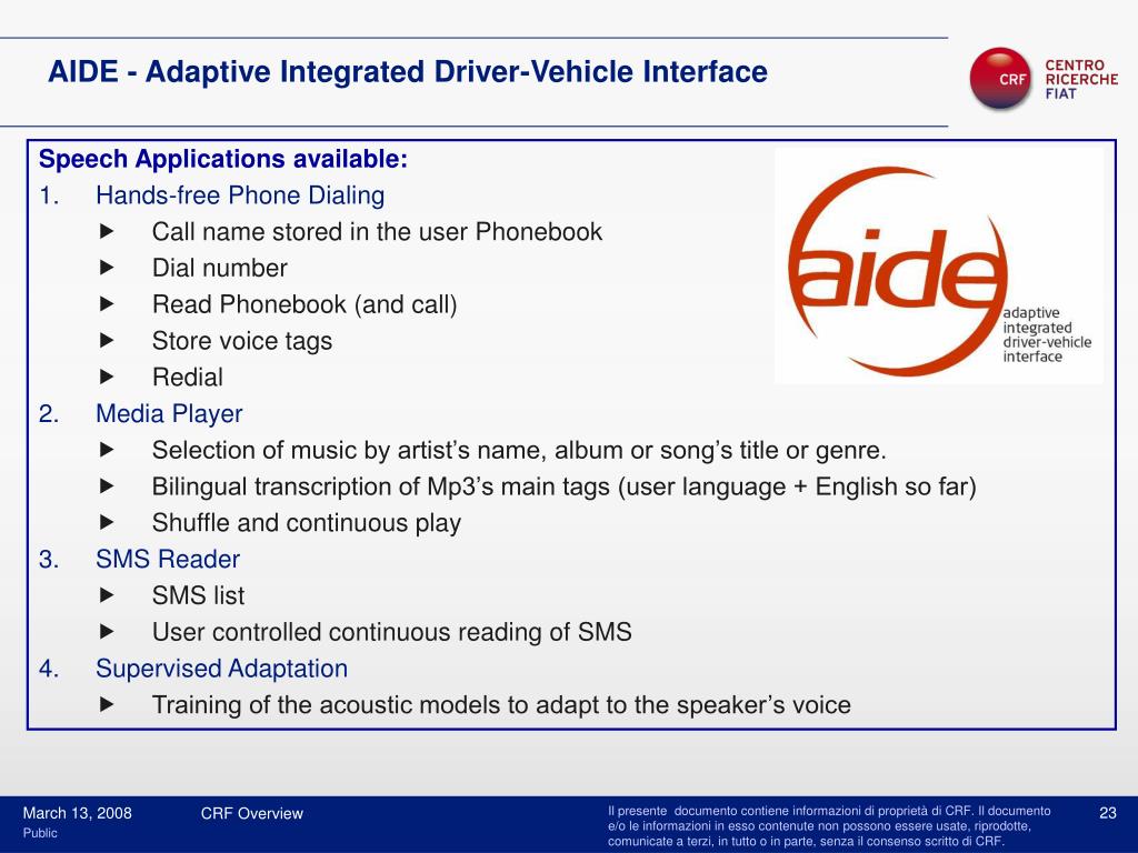 AIDE - Adaptive Integrated Driver-Vehicle Interface • Speech Applications available: • Hands-free Phone Dialing • Call name stored in the user Phonebook • Dial number • Read Phonebook (and call) • Store voice tags • Redial • Media Player • Selection of music by artist’s name, album or song’s title or genre. • Bilingual transcription of Mp3’s main tags (user language + English so far) • Shuffle and continuous play • SMS Reader • SMS list • User controlled continuous reading of SMS • Supervised Adaptation • Training of the acoustic models to adapt to the speaker’s voice CRF Overview