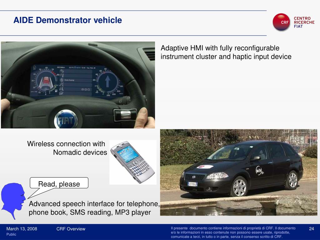 AIDE Demonstrator vehicle Adaptive HMI with fully reconfigurable instrument cluster and haptic input device Wireless connection with Nomadic devices Read, please Advanced speech interface for telephone, phone book, SMS reading, MP3 player CRF Overview