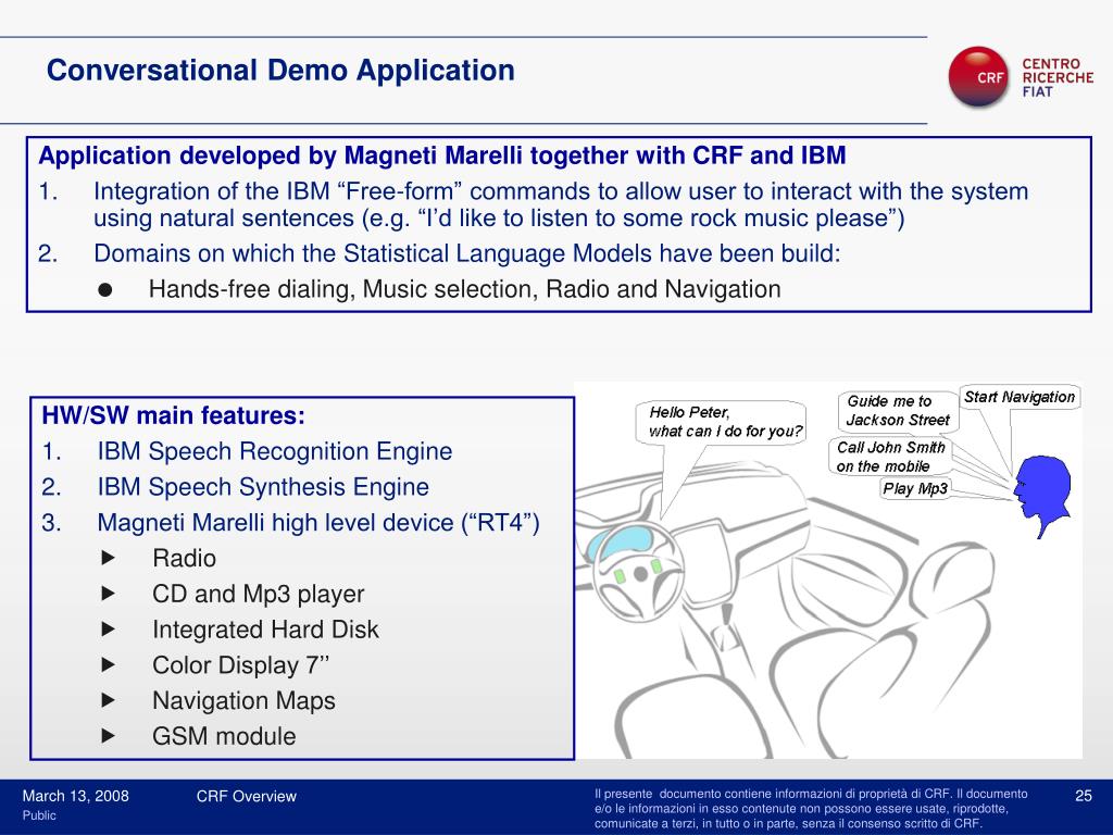 Conversational Demo Application • Application developed by Magneti Marelli together with CRF and IBM • Integration of the IBM “Free-form” commands to allow user to interact with the system using natural sentences (e.g. “I’d like to listen to some rock music please”) • Domains on which the Statistical Language Models have been build: • Hands-free dialing, Music selection, Radio and Navigation • HW/SW main features: • IBM Speech Recognition Engine • IBM Speech Synthesis Engine • Magneti Marelli high level device (“RT4”) • Radio • CD and Mp3 player • Integrated Hard Disk • Color Display 7’’ • Navigation Maps • GSM module CRF Overview