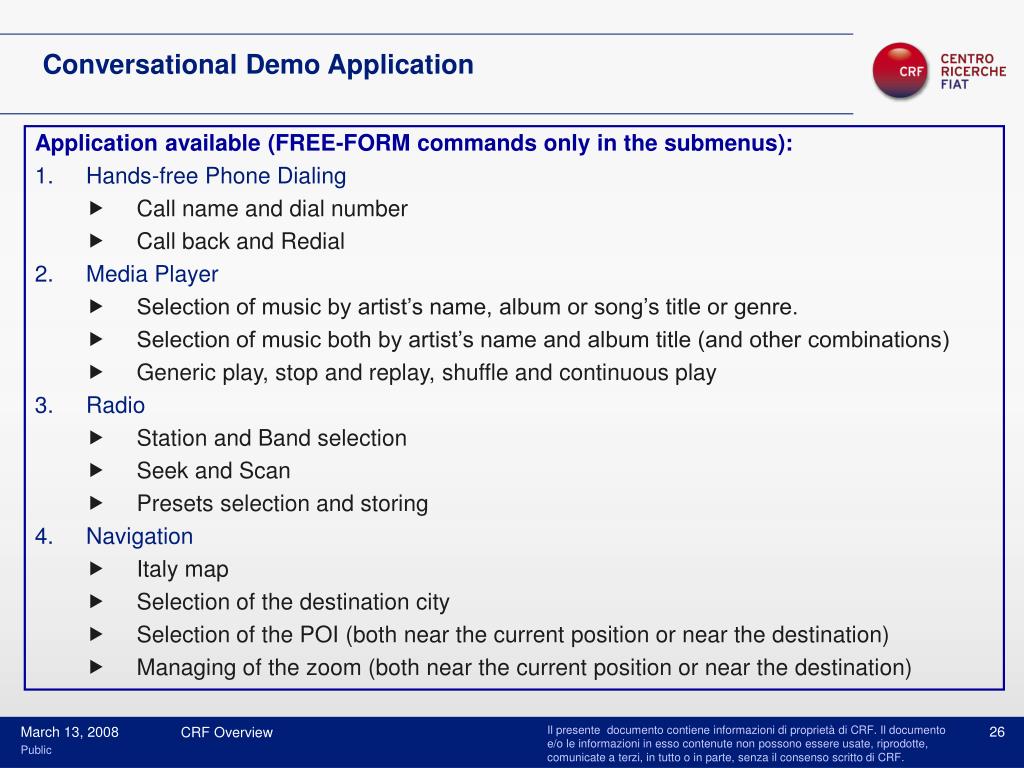 Conversational Demo Application • Application available (FREE-FORM commands only in the submenus): • Hands-free Phone Dialing • Call name and dial number • Call back and Redial • Media Player • Selection of music by artist’s name, album or song’s title or genre. • Selection of music both by artist’s name and album title (and other combinations) • Generic play, stop and replay, shuffle and continuous play • Radio • Station and Band selection • Seek and Scan • Presets selection and storing • Navigation • Italy map • Selection of the destination city • Selection of the POI (both near the current position or near the destination) • Managing of the zoom (both near the current position or near the destination) CRF Overview
