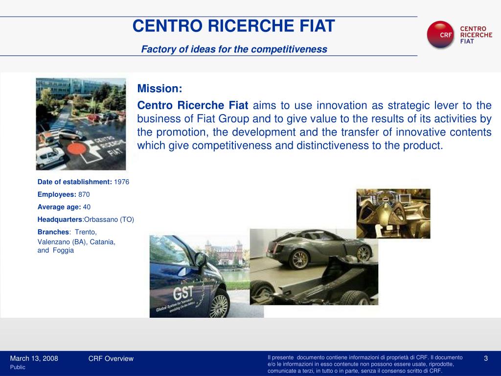 CENTRO RICERCHE FIATFactory of ideas for the competitiveness Mission: Centro Ricerche Fiat aims to use innovation as strategic lever to the business of Fiat Group and to give value to the results of its activities by the promotion, the development and the transfer of innovative contents which give competitiveness and distinctiveness to the product. Date of establishment: 1976 Employees: 870 Average age: 40 Headquarters:Orbassano (TO) Branches: Trento, Valenzano (BA), Catania, and Foggia CRF Overview