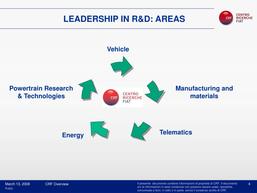 LEADERSHIP IN R&D: AREAS Vehicle Powertrain Research & Technologies Manufacturing and materials Telematics Energy CRF Overview