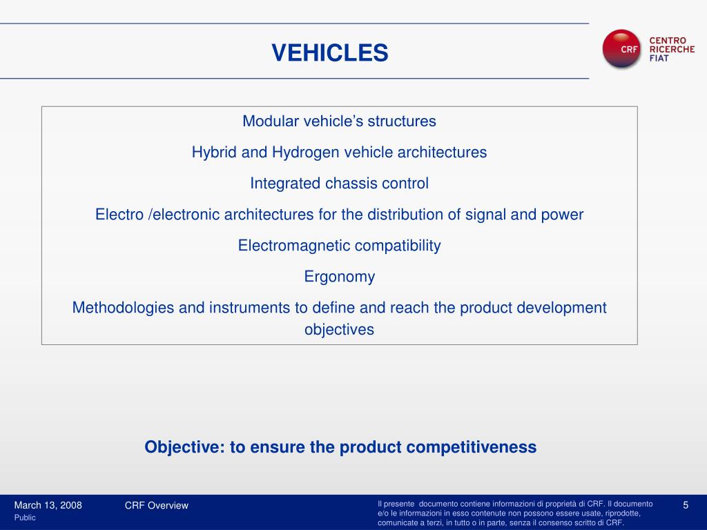 VEHICLES Modular vehicle’s structures Hybrid and Hydrogen vehicle architectures Integrated chassis control Electro /electronic architectures for the distribution of signal and power Electromagnetic compatibility Ergonomy Methodologies and instruments to define and reach the product development objectives Objective: to ensure the product competitiveness CRF Overview