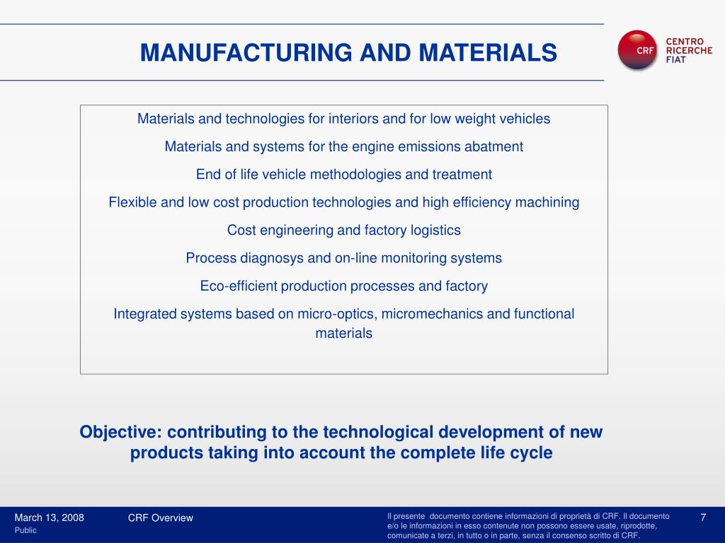 MANUFACTURING AND MATERIALS Materials and technologies for interiors and for low weight vehicles Materials and systems for the engine emissions abatment End of life vehicle methodologies and treatment Flexible and low cost production technologies and high efficiency machining Cost engineering and factory logistics Process diagnosys and on-line monitoring systems Eco-efficient production processes and factory Integrated systems based on micro-optics, micromechanics and functional materials Objective: contributing to the technological development of new products taking into account the complete life cycle CRF Overview