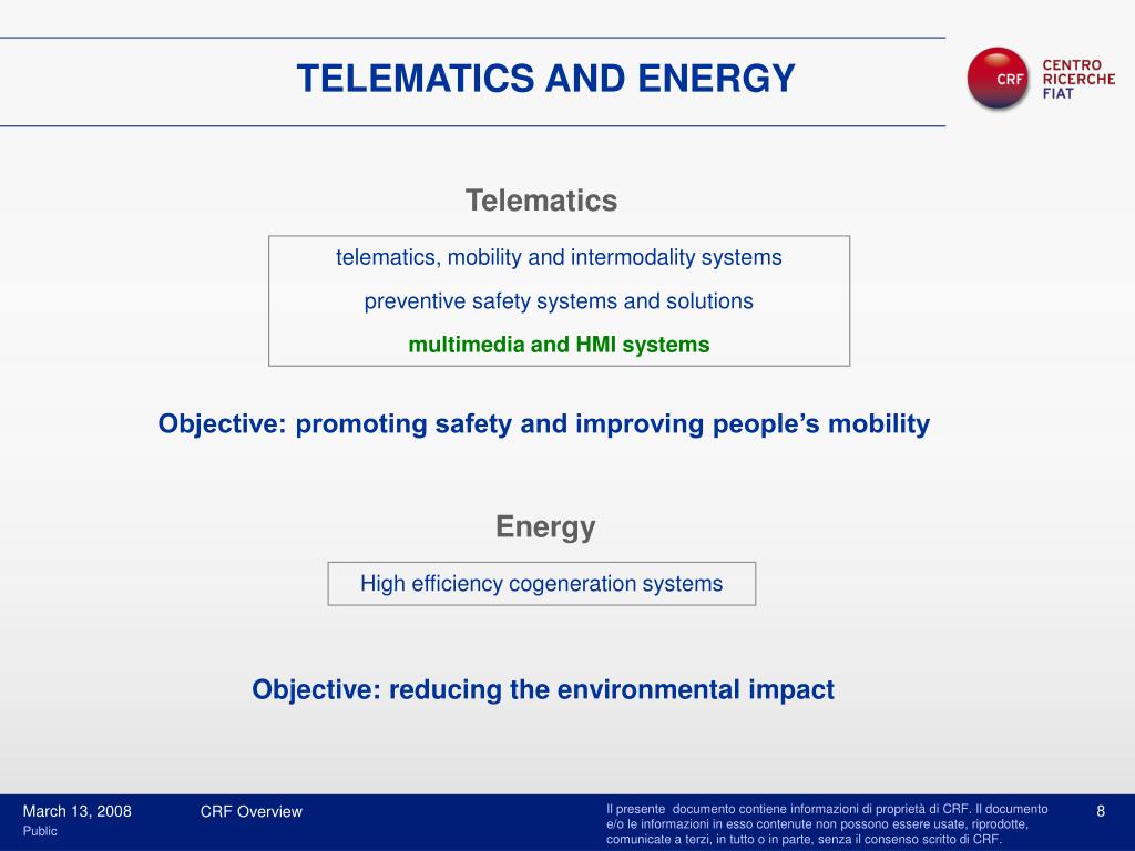 TELEMATICS AND ENERGY Telematics telematics, mobility and intermodality systems preventive safety systems and solutions multimedia and HMI systems Objective: promoting safety and improving people’s mobility Energy High efficiency cogeneration systems Objective: reducing the environmental impact CRF Overview