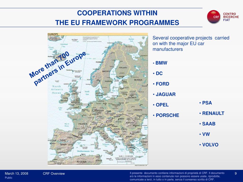 COOPERATIONS WITHIN THE EU FRAMEWORK PROGRAMMES Several cooperative projects carried on with the major EU car manufacturers More than 700 partners in Europe • BMW • DC • FORD • JAGUAR • OPEL • PORSCHE • PSA • RENAULT • SAAB • VW • VOLVO CRF Overview