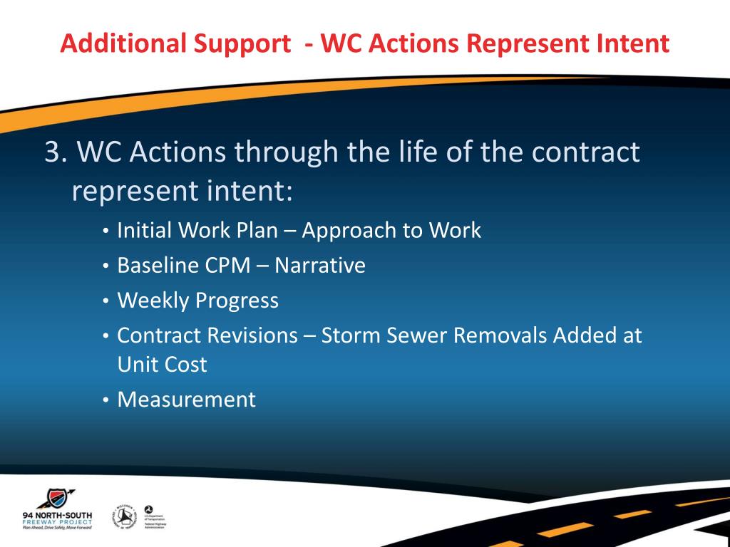 Additional Support - WC Actions Represent Intent • 3. WC Actions through the life of the contract represent intent: • Initial Work Plan – Approach to Work • Baseline CPM – Narrative • Weekly Progress • Contract Revisions – Storm Sewer Removals Added at Unit Cost • Measurement