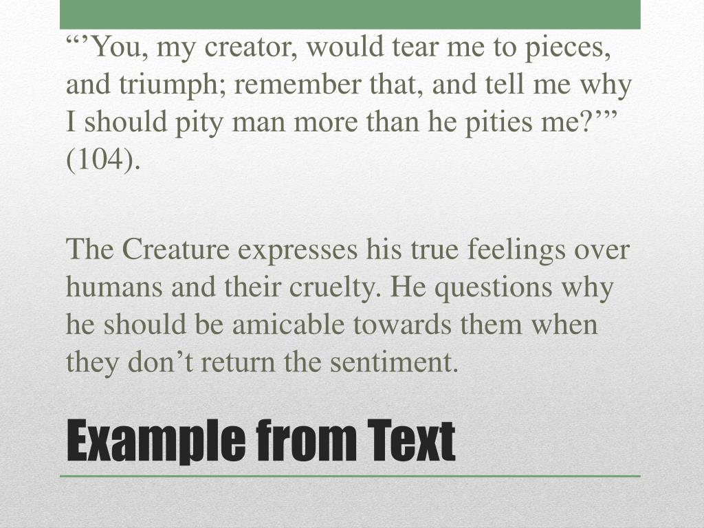 “’You, my creator, would tear me to pieces, and triumph; remember that, and tell me why I should pity man more than he pities me?’” (104). The Creature expresses his true feelings over humans and their cruelty. He questions why he should be amicable towards them when they don’t return the sentiment. Example from Text
