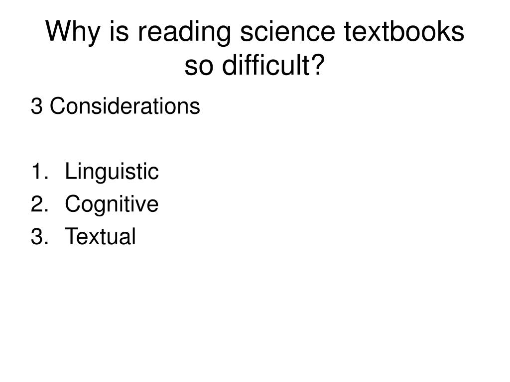 Why is reading science textbooks so difficult? 3 Considerations • Linguistic • Cognitive • Textual