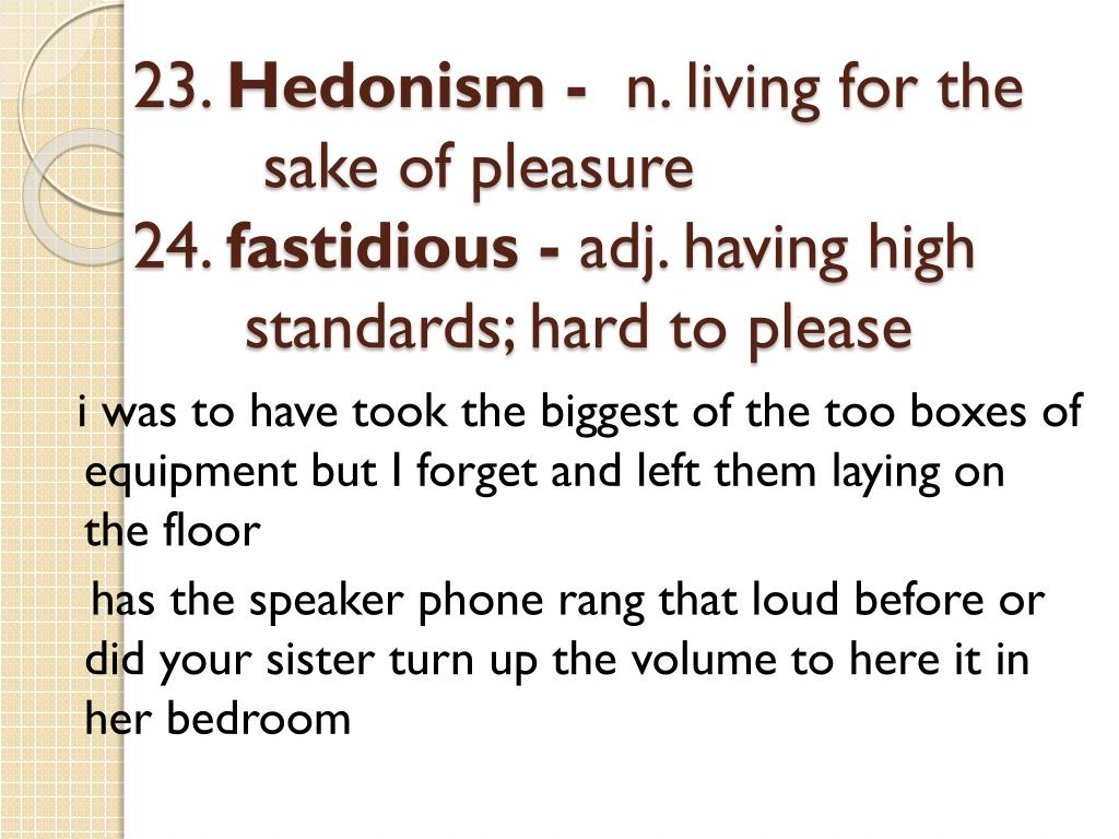 23. Hedonism - n. living for the sake of pleasure24. fastidious - adj. having high standards; hard to please i was to have took the biggest of the too boxes of equipment but I forget and left them laying on the floor has the speaker phone rang that loud before or did your sister turn up the volume to here it in her bedroom