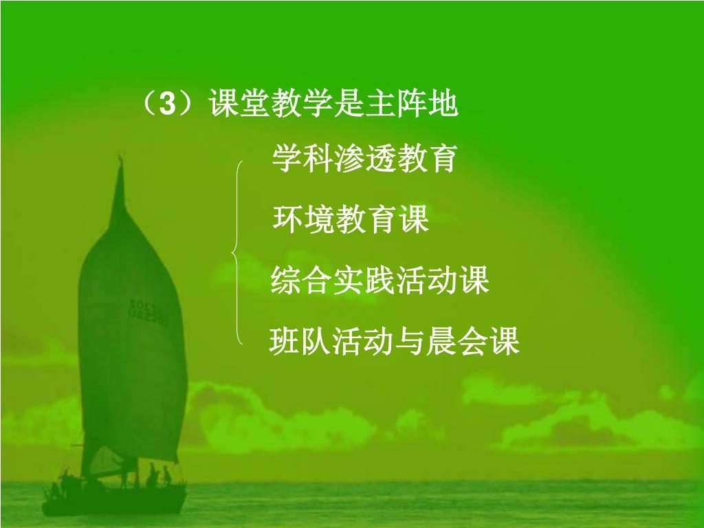 (3)课堂教学是主阵地 学科渗透教育 环境教育课 综合实践活动课 班队活动与晨会课