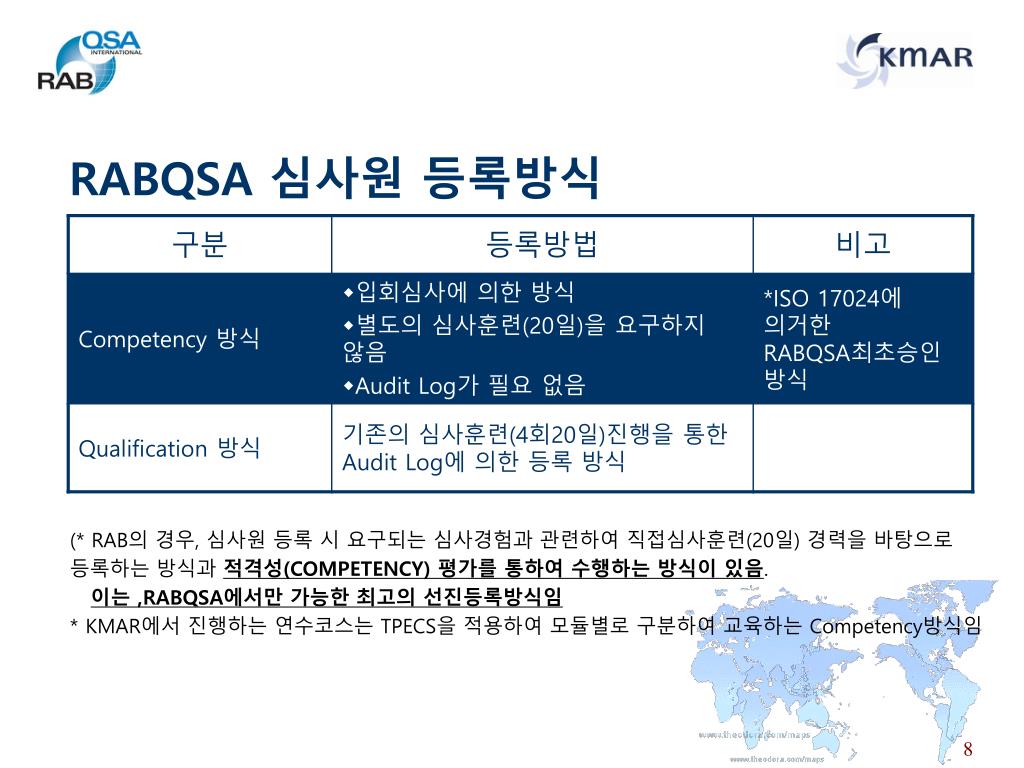 RABQSA 심사원 등록방식 (* RAB의 경우, 심사원 등록 시 요구되는 심사경험과 관련하여 직접심사훈련(20일) 경력을 바탕으로 등록하는 방식과 적격성(COMPETENCY) 평가를 통하여 수행하는 방식이 있음. 이는 ,RABQSA에서만 가능한 최고의 선진등록방식임 * KMAR에서 진행하는 연수코스는 TPECS을 적용하여 모듈별로 구분하여 교육하는 Competency방식임