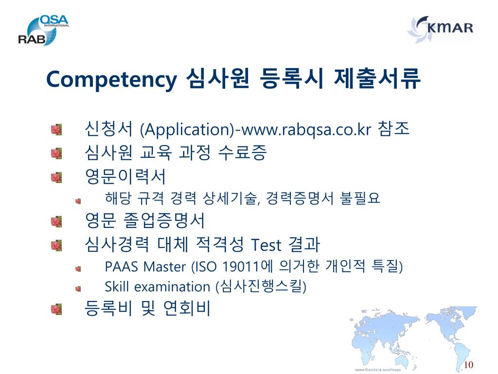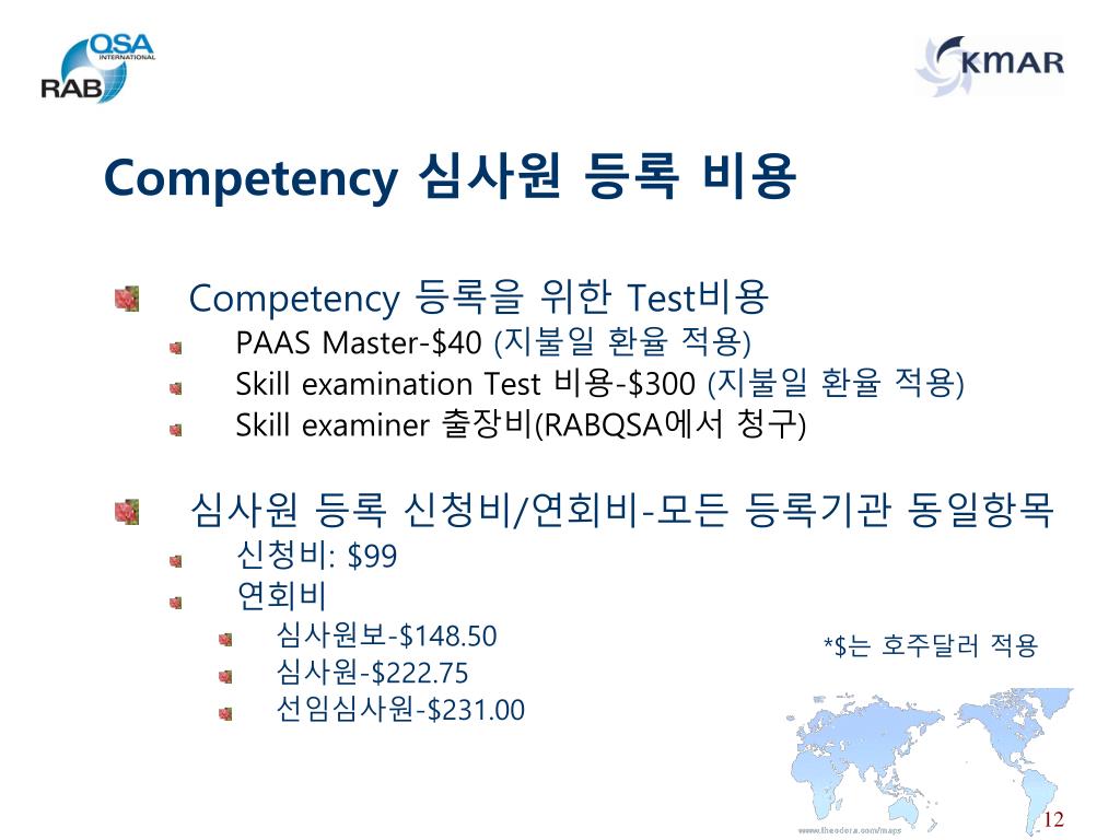 Competency 심사원 등록 비용 • Competency 등록을 위한 Test비용 • PAAS Master-$40 (지불일 환율 적용) • Skill examination Test 비용-$300 (지불일 환율 적용) • Skill examiner 출장비(RABQSA에서 청구) • 심사원 등록 신청비/연회비-모든 등록기관 동일항목 • 신청비: $99 • 연회비 • 심사원보-$148.50 • 심사원-$222.75 • 선임심사원-$231.00 *$는 호주달러 적용