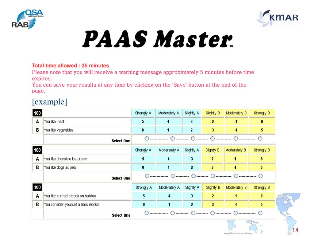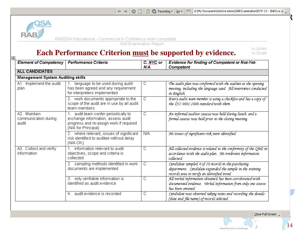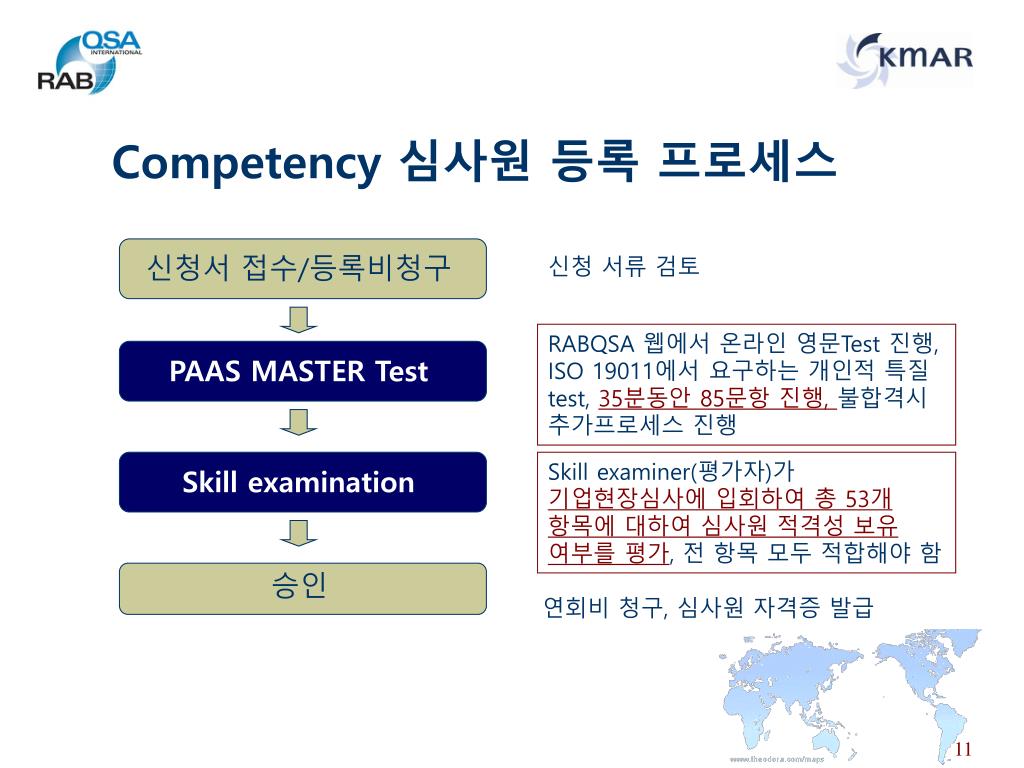 Competency 심사원 등록 프로세스 신청서 접수/등록비청구 신청 서류 검토 RABQSA 웹에서 온라인 영문Test 진행, ISO 19011에서 요구하는 개인적 특질 test, 35분동안 85문항 진행, 불합격시 추가프로세스 진행 PAAS MASTER Test Skill examiner(평가자)가 기업현장심사에 입회하여 총 53개 항목에 대하여 심사원 적격성 보유 여부를 평가, 전 항목 모두 적합해야 함 Skill examination 승인 연회비 청구, 심사원 자격증 발급