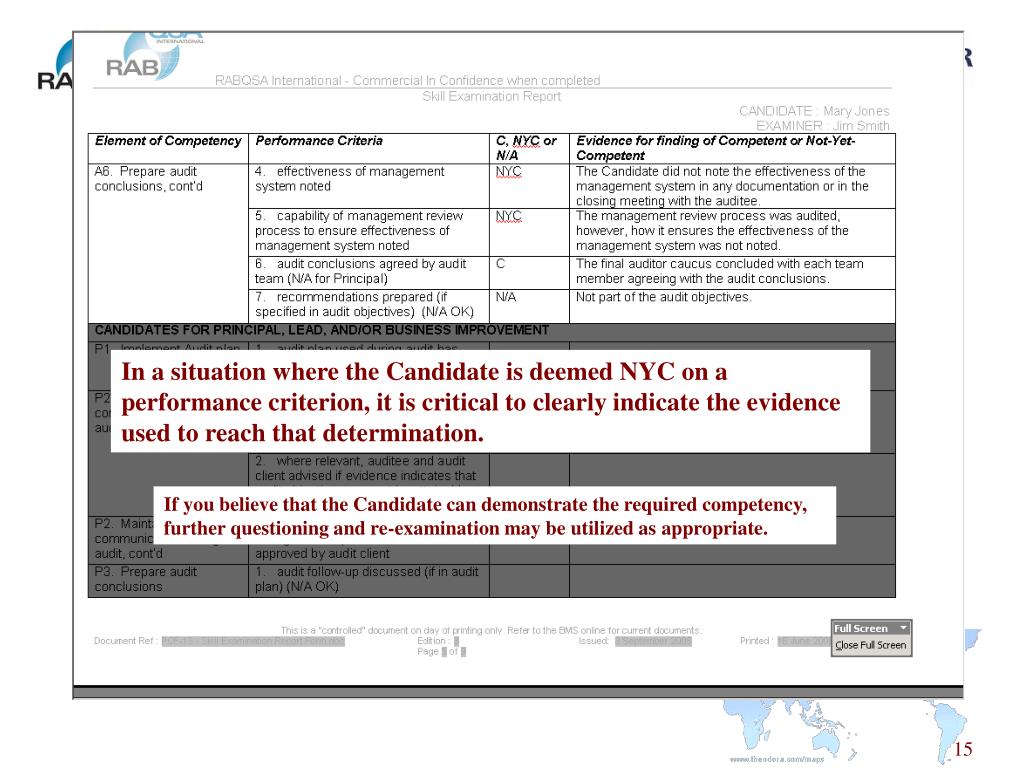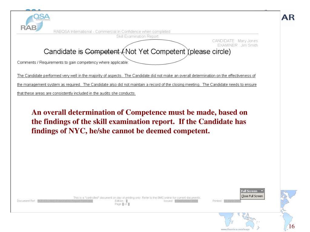 An overall determination of Competence must be made, based on the findings of the skill examination report. If the Candidate has findings of NYC, he/she cannot be deemed competent.