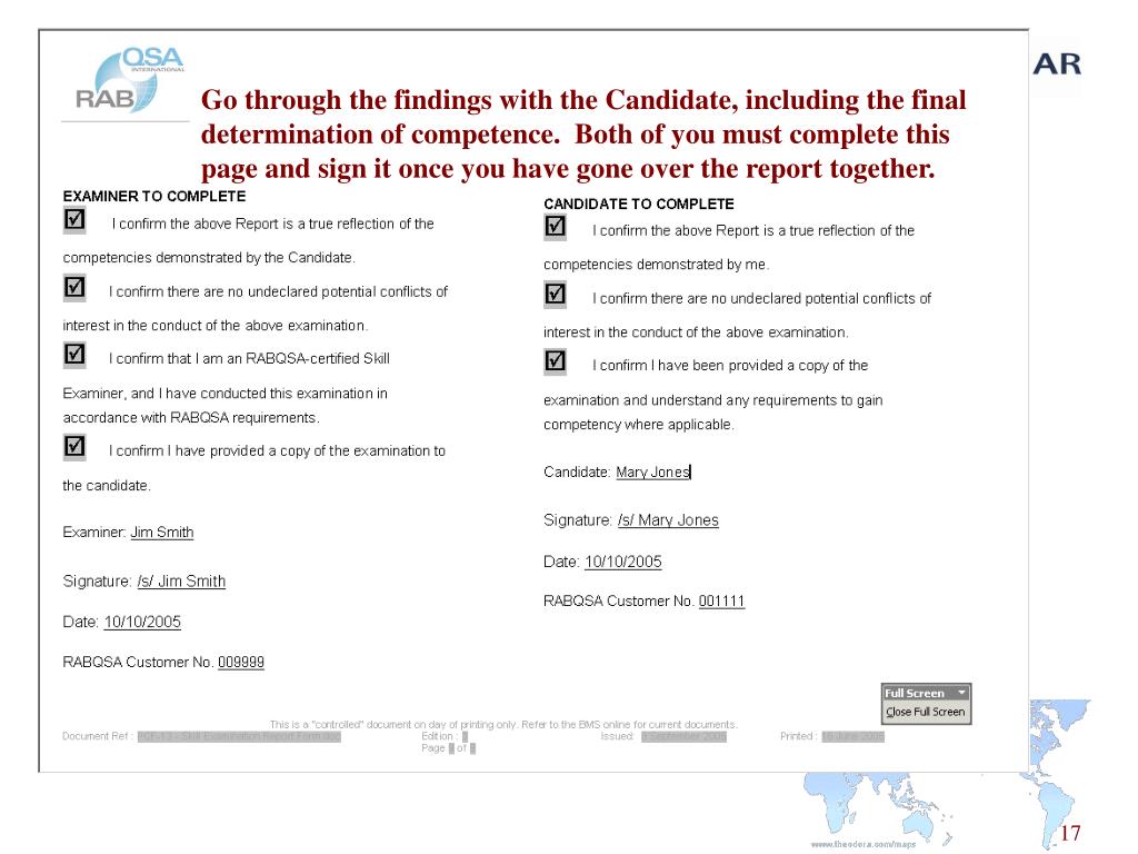 Go through the findings with the Candidate, including the final determination of competence. Both of you must complete this page and sign it once you have gone over the report together.