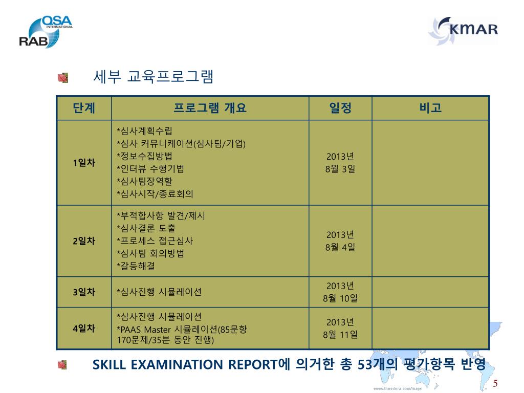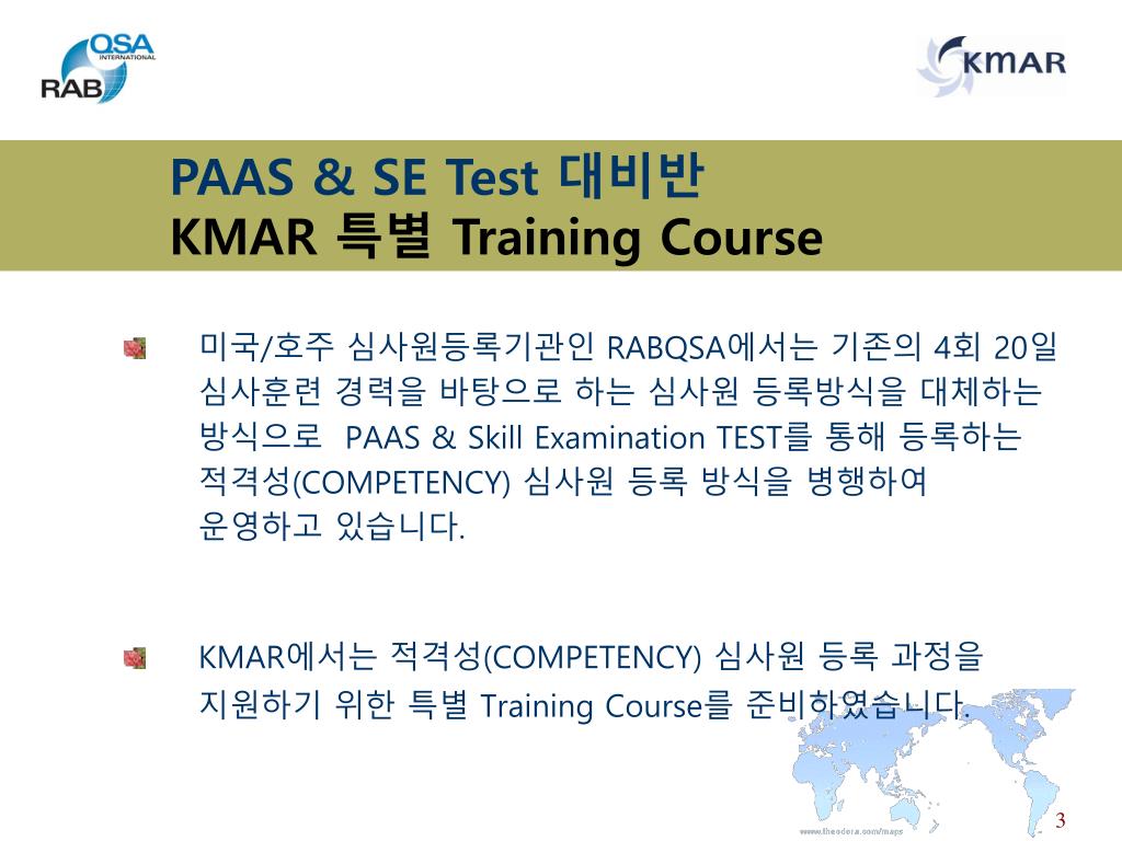 PAAS & SE Test 대비반 KMAR 특별 Training Course • 미국/호주 심사원등록기관인 RABQSA에서는기존의 4회 20일 심사훈련 경력을 바탕으로 하는 심사원 등록방식을 대체하는 방식으로 PAAS & Skill Examination TEST를 통해 등록하는 적격성(COMPETENCY) 심사원 등록 방식을 병행하여 운영하고 있습니다. • KMAR에서는 적격성(COMPETENCY) 심사원 등록 과정을 지원하기 위한 특별 Training Course를 준비하였습니다.