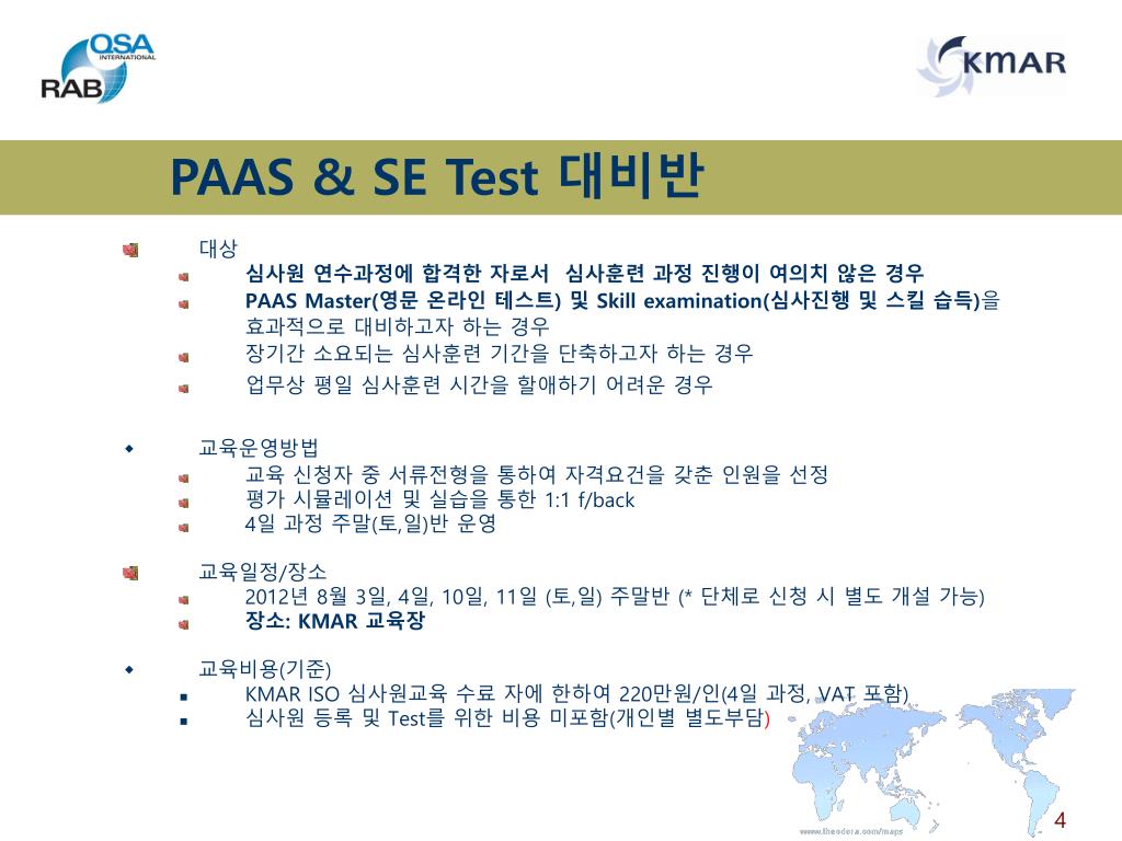 PAAS & SE Test 대비반 • 대상 • 심사원 연수과정에 합격한 자로서 심사훈련 과정 진행이 여의치 않은 경우 • PAAS Master(영문 온라인 테스트) 및 Skill examination(심사진행및 스킬 습득)을 효과적으로 대비하고자 하는 경우 • 장기간 소요되는 심사훈련 기간을 단축하고자 하는 경우 • 업무상 평일 심사훈련 시간을 할애하기 어려운 경우 • 교육운영방법 • 교육 신청자 중 서류전형을 통하여 자격요건을 갖춘 인원을 선정 • 평가 시뮬레이션 및 실습을 통한 1:1 f/back • 4일 과정 주말(토,일)반 운영 • 교육일정/장소 • 2012년 8월 3일, 4일, 10일, 11일 (토,일) 주말반 (* 단체로 신청 시 별도 개설 가능) • 장소: KMAR 교육장 • 교육비용(기준) • KMAR ISO 심사원교육 수료 자에 한하여 220만원/인(4일 과정, VAT 포함) • 심사원 등록 및 Test를 위한 비용 미포함(개인별 별도부담)