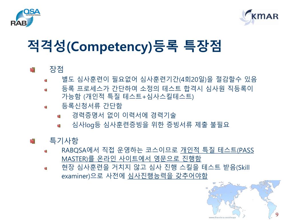 적격성(Competency)등록 특장점 • 장점 • 별도 심사훈련이 필요없어 심사훈련기간(4회20일)을 절감할수 있음 • 등록 프로세스가 간단하여 소정의 테스트 합격시 심사원 직등록이 가능함 (개인적 특질 테스트+심사스킬테스트) • 등록신청서류 간단함 • 경력증명서 없이 이력서에 경력기술 • 심사log등 심사훈련증빙을 위한 증빙서류 제출 불필요 • 특기사항 • RABQSA에서 직접 운영하는 코스이므로 개인적 특질 테스트(PASS MASTER)를 온라인 사이트에서 영문으로 진행함 • 현장 심사훈련을 거치지 않고 심사 진행 스킬을 테스트 받음(Skill examiner)으로 사전에 심사진행능력을 갖추어야함