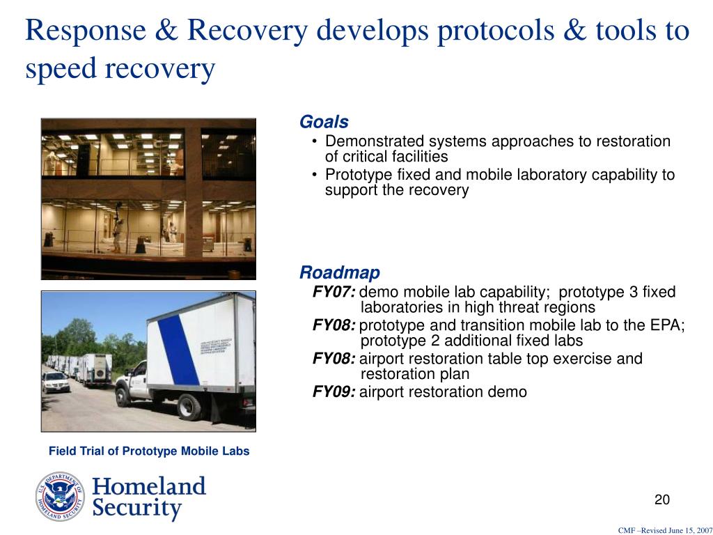 Response & Recovery develops protocols & tools to speed recovery • Goals • Demonstrated systems approaches to restoration of critical facilities • Prototype fixed and mobile laboratory capability to support the recovery • Roadmap • FY07: demo mobile lab capability; prototype 3 fixed laboratories in high threat regions • FY08: prototype and transition mobile lab to the EPA; prototype 2 additional fixed labs • FY08: airport restoration table top exercise and restoration plan • FY09: airport restoration demo Field Trial of Prototype Mobile Labs