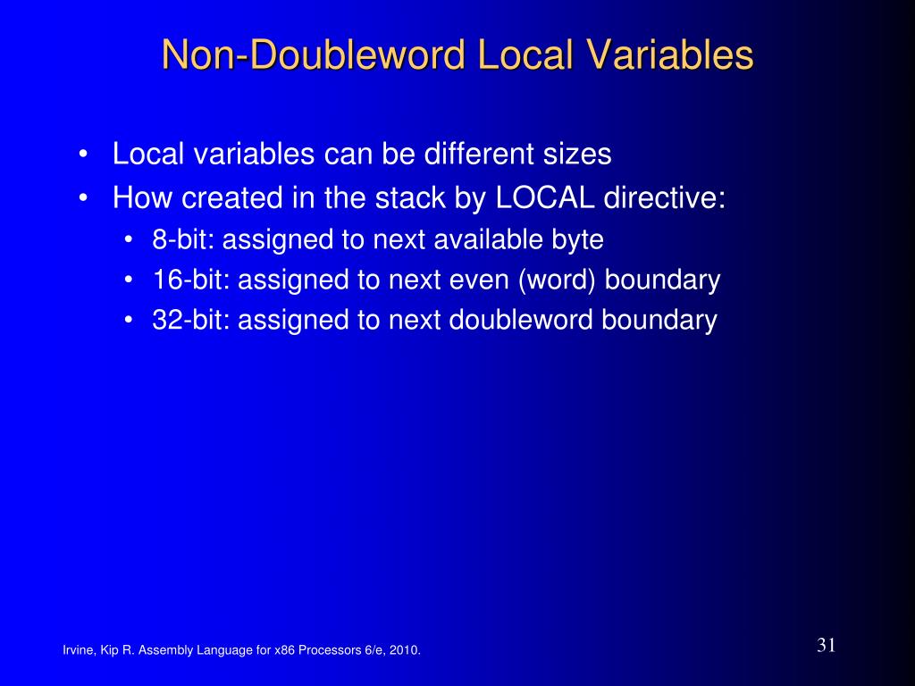 Non-Doubleword Local Variables • Local variables can be different sizes • How created in the stack by LOCAL directive: • 8-bit: assigned to next available byte • 16-bit: assigned to next even (word) boundary • 32-bit: assigned to next doubleword boundary Irvine, Kip R. Assembly Language for x86 Processors 6/e, 2010.
