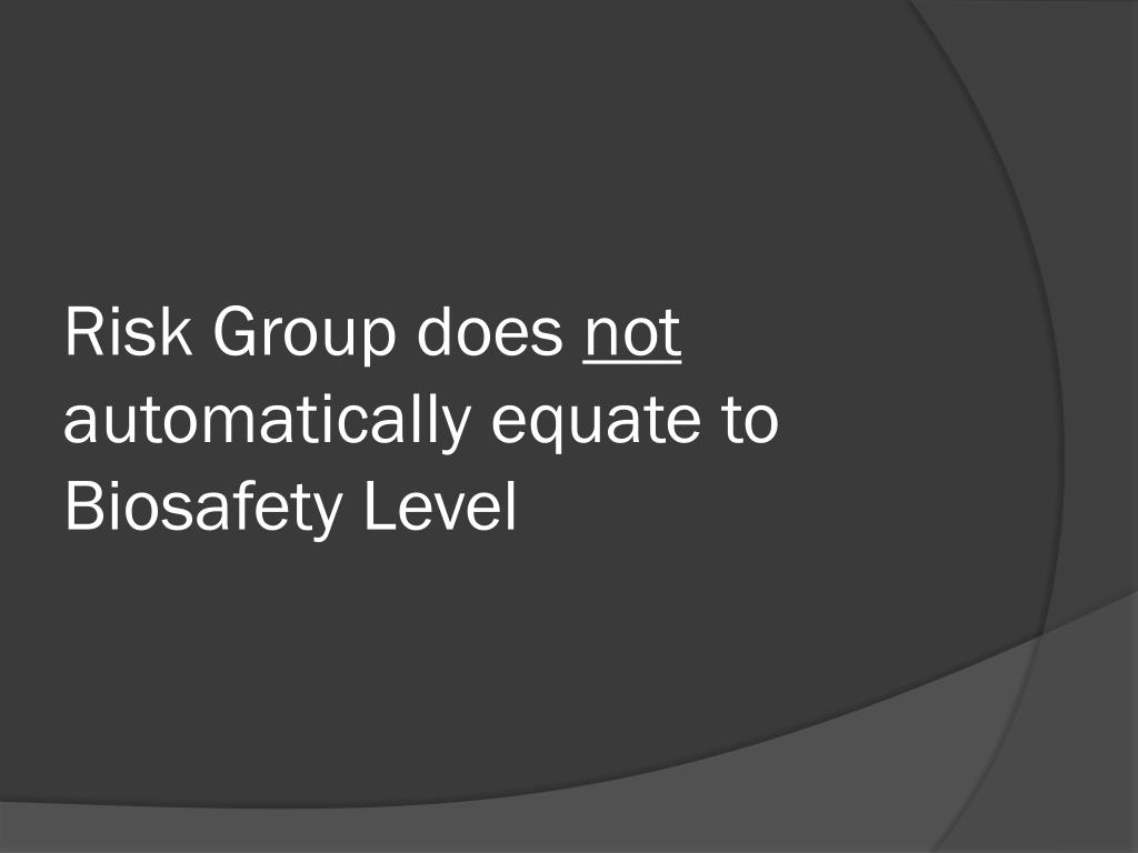 Risk Groups • Risk Group 1 • No or low individual and community risk • Unlikely to cause disease in healthy subject • Risk Group 2 • Moderate individual risk, low community risk • Can cause disease Lab exposures may result in infection, but effective treatment and preventative measures are likely available and risk of spread of infection is limited • Usually fecal/oral or inoculation hazard • Risk Group 3 • High individual risk, low community risk • Usually causes serious disease but does not easily spread. Effective treatment and preventative measures are likely available. • Usually airborne hazard • Risk Group 4 • High individual and community risk • Causes serious disease and can be readily transmitted. Effective treatment and preventative measures are not usually available • viral