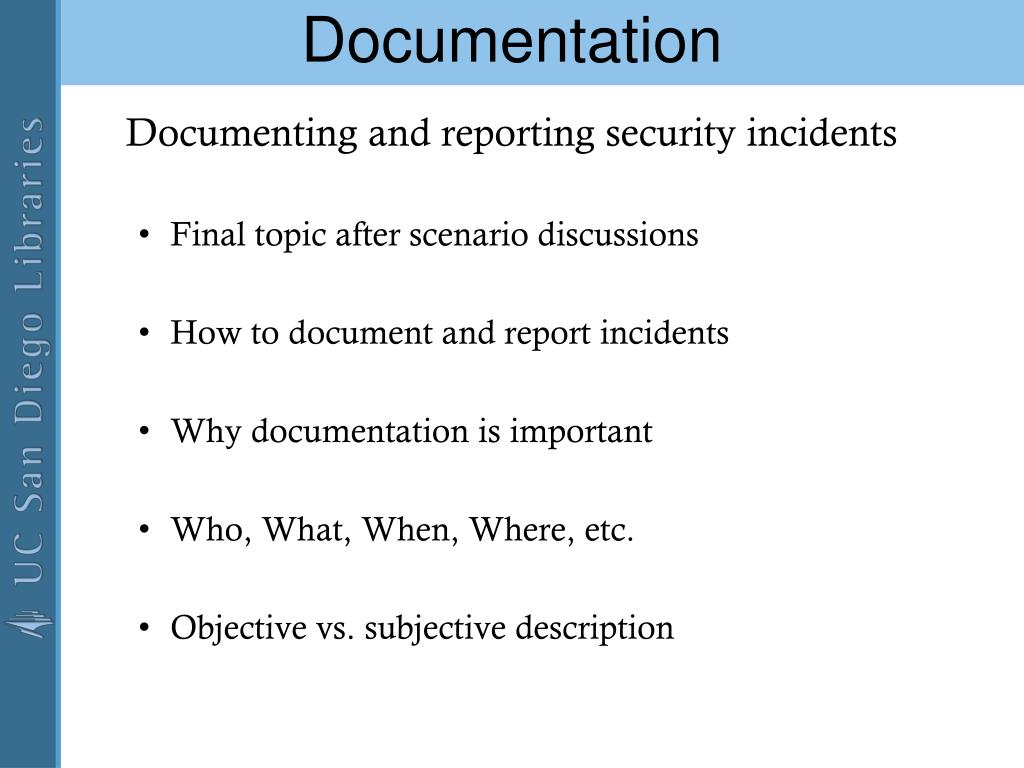 Documentation Documenting and reporting security incidents • Final topic after scenario discussions • How to document and report incidents • Why documentation is important • Who, What, When, Where, etc. • Objective vs. subjective description