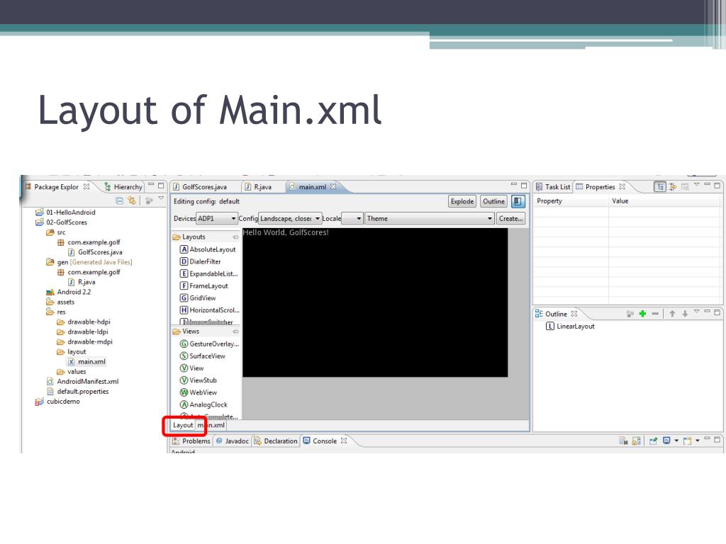 Beyond the Hello World -Golf Scores. Frank Xu Gannon University. Reference. Learn how to develop for Android, Beyond HelloWorld http://www.youtube.com/watch?v=rm-hNlTD1H0. main.xml. Layout of Main.xml. TextView = label (Java). Property ( Name,Values pair) .