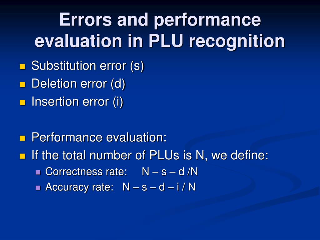 Errors and performance evaluation in PLU recognition • Substitution error (s) • Deletion error (d) • Insertion error (i) • Performance evaluation: • If the total number of PLUs is N, we define: • Correctness rate: N – s – d /N • Accuracy rate: N – s – d – i / N