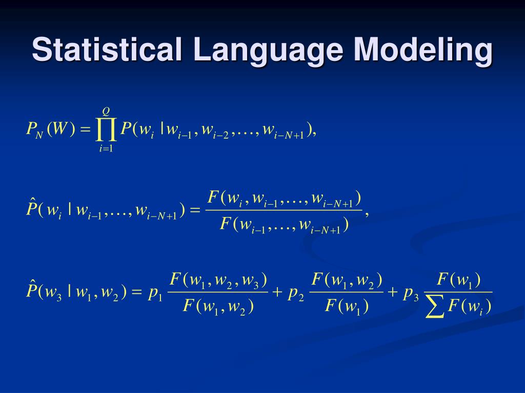 We often compute H based on a finite but sufficiently large Q: H is the degree of difficulty that the recognizer encounters, on average, When it is to determine a word from the same source. Using language model, if the N-gram language model PN(W) is used, An estimate of H is: In general: Perplexity is defined as: